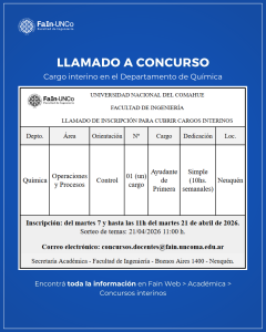 16/04/2025 | La Secretaría Académica informa un nuevo llamado a inscripción a cargo interino en el Departamento de Química