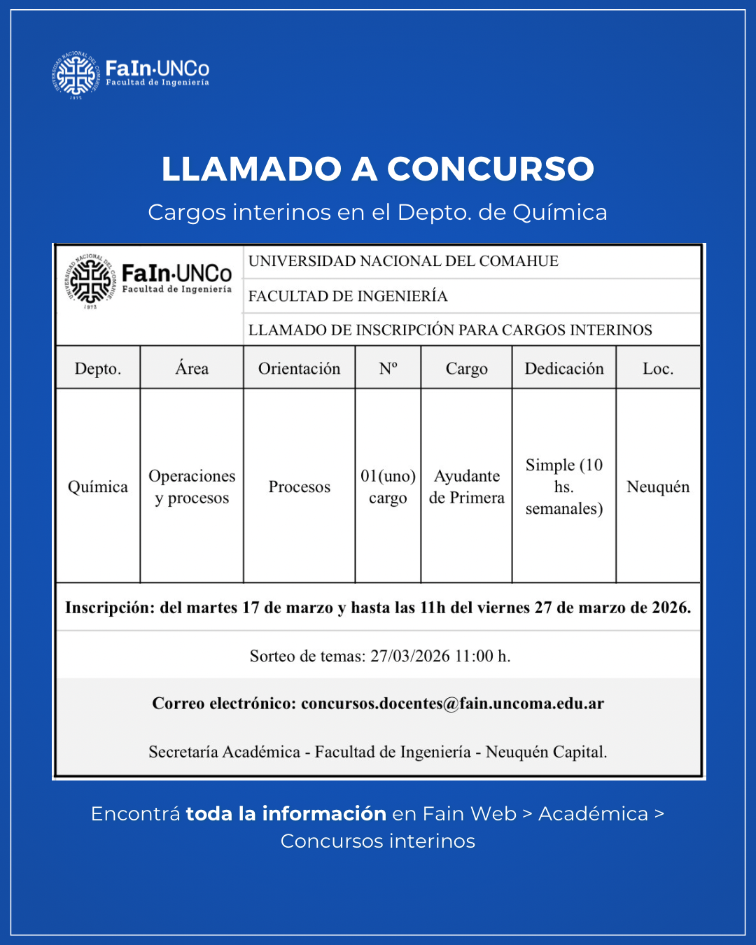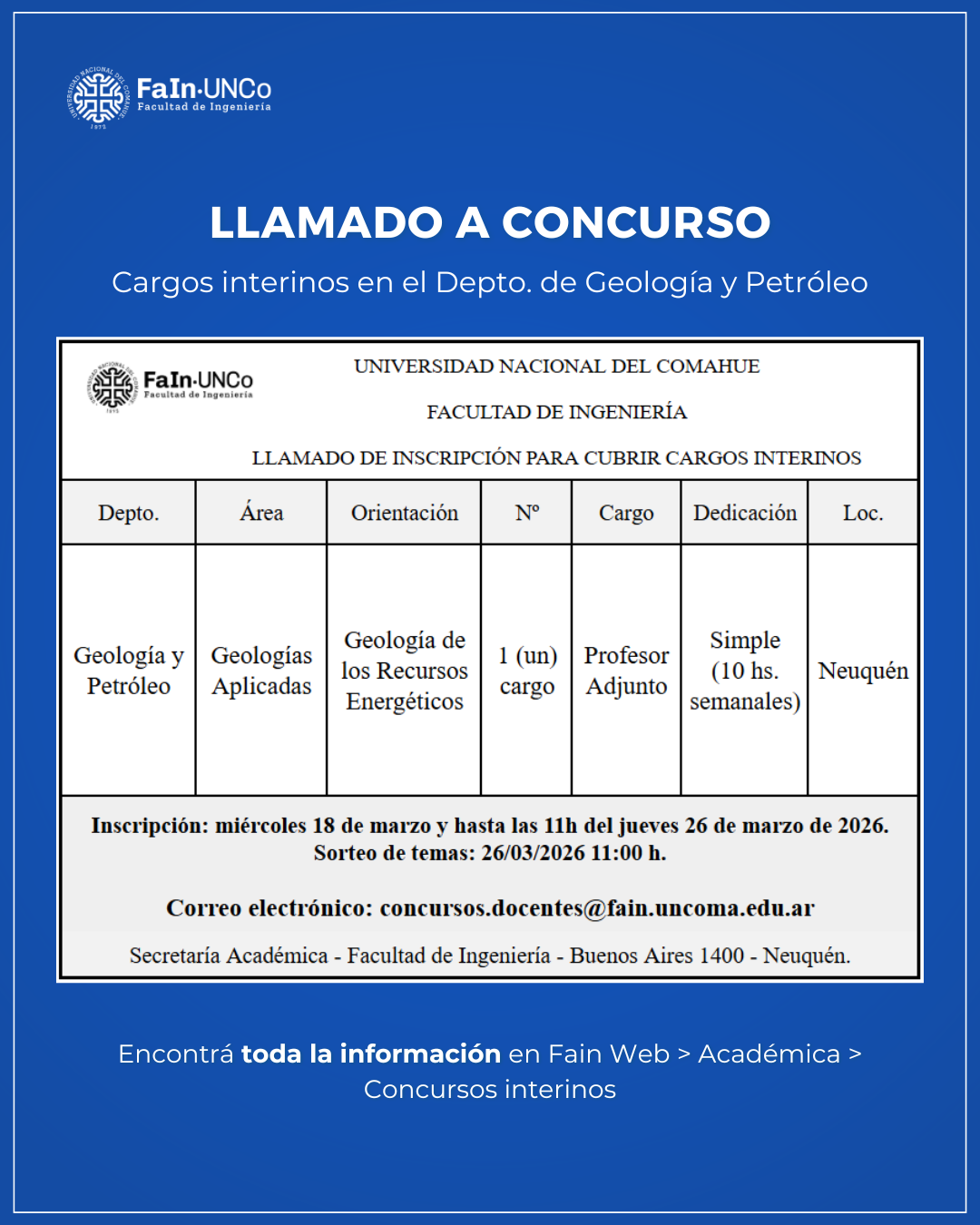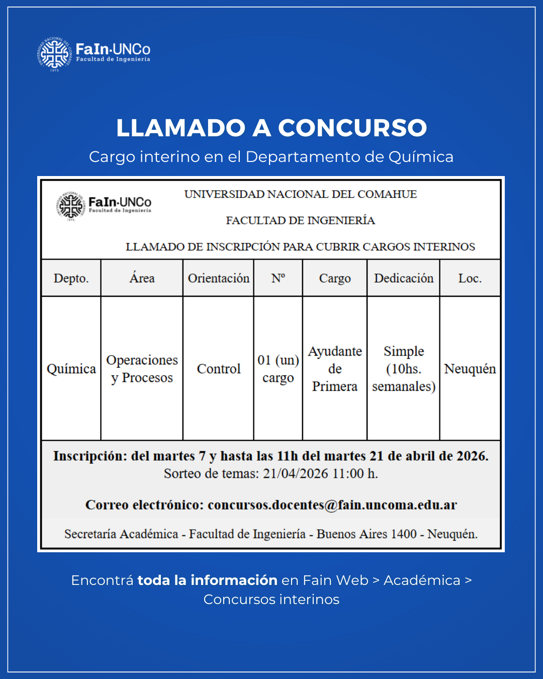 La Solicitud de Inscripción* y documentación se debe enviar por mail a concursos.docentes@fain.uncoma.edu.ar