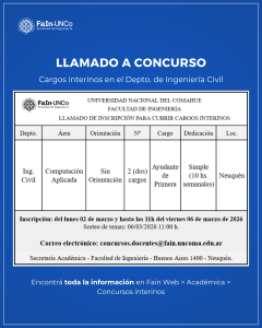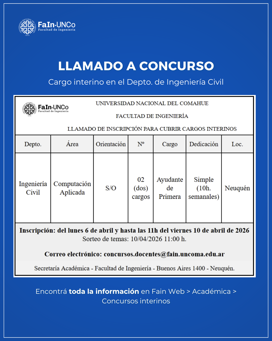 16/04/2025 | La Secretaría Académica informa un nuevo llamado a inscripción a 2 (dos) cargos interinos en el Depto. de Ing. Civil
