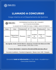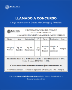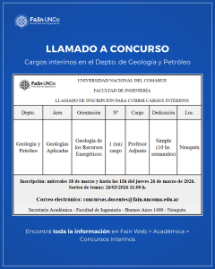 01/09/2025 | La Secretaría Académica informa un nuevo llamado a inscripción a un cargo interinos en el Depto. de Geología y Petróleo