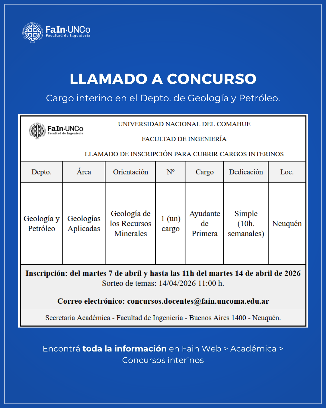 12/09/2025 | La Secretaría Académica informa un nuevo llamado a inscripción a un cargo interino en el Depto. de Geología y Petróleo