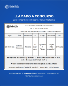 07/04/2026| La Secretaría Académica informa un nuevo llamado a inscripción a cargos interinos en el Depto. de Electrotecnia.
